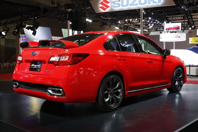 De knalrode sedan op de foto's is de Legacy Biltzen Concept, een Premium Red gespoten sedan die rondom is voorzien van een bodykit. We zien een imposante achterbumper met daarin verwerkte uitlaatpijpen. Ook de voorbumper is vervangen voor een groter exemplaar met forse luchtinlaten. Achterop de Legacy vinden we een behoorlijk prominent aanwezige spoiler.