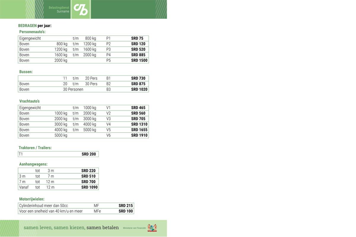 2019 is het eerste jaar waarover Surinaamse voertuigbezitters rij- en voertuigenbelasting verschuldigd zijn. De betaling daarvan geschiedt per jaar en gaat net als in Nederland op gewicht, al zijn de tarieven wel een stuk vriendelijker.