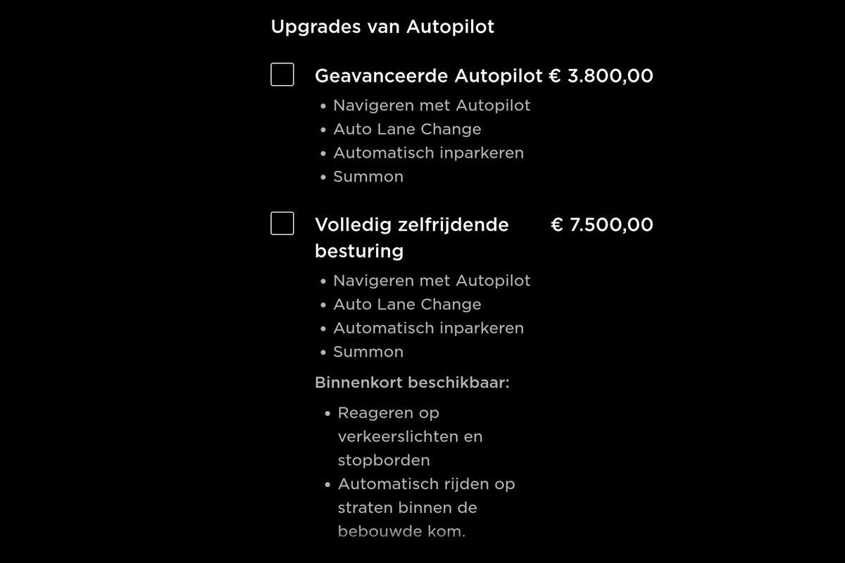 Dat pakket is voor de meest actuele modellen puur softwarematig en kan dus middels een over-the-air-upgrade op de auto worden geactiveerd. Goedkoop is dat niet: op het moment van schrijven kost ‘Volledig zelfrijdende besturing’ in Nederland €7.500.