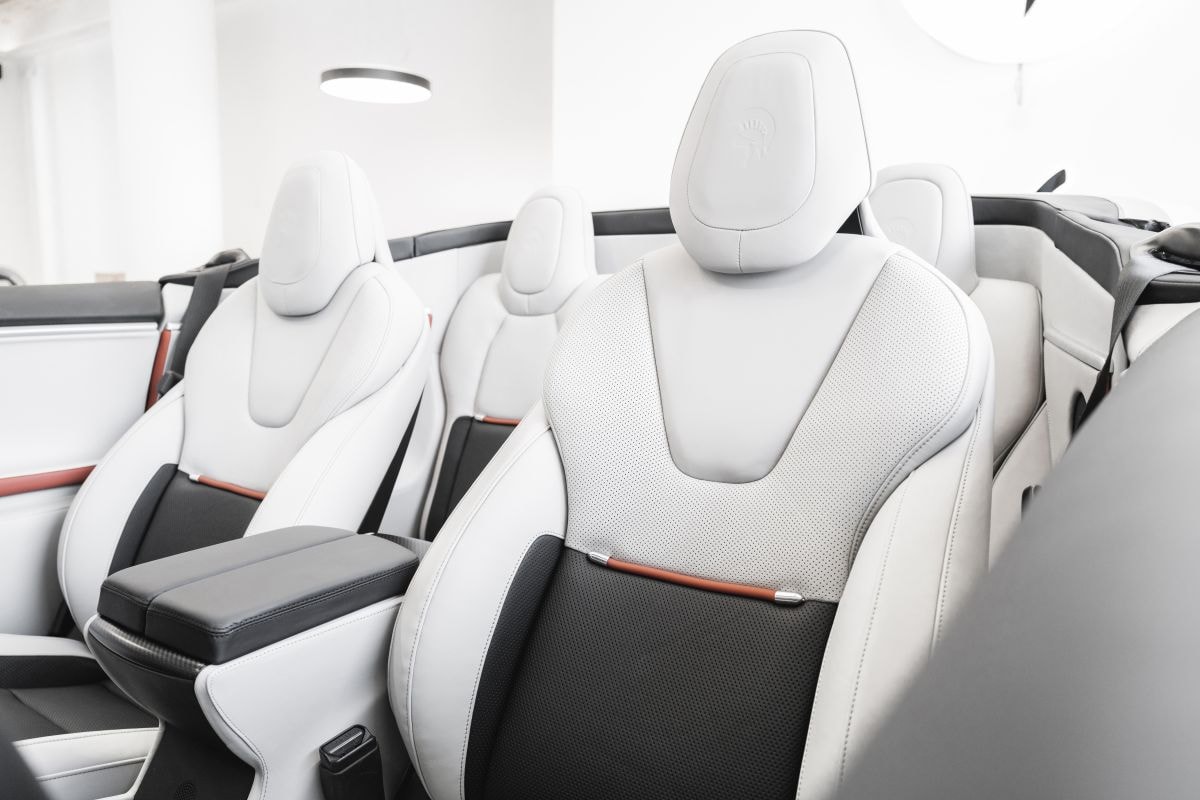 Achter de voorstoelen tref je voortaan twee speciaal voor de cabriolet ontworpen zetels die gemodelleerd zijn naar de voorstoelen. Het interieur is in een opvallende combinatie van wit, oranje en grijs uitgevoerd, met stiksels in het leer die met de hand zijn aangebracht. Daar houden de wijzigingen niet op. Ares Design heeft namelijk ook het front ligt aangepast. Een nieuwe voorbumper geeft 'm een eigenzinniger voorkomen. Ook troont de Model S Convertible op lichtmetalen wielen die van de schappen van het Italiaanse bedrijf gehaald zijn. Tenslotte kleedde Ares Design de auto verder aan met enkele subtiele koolstofvezel extra's op de bumpers en sideskirts.