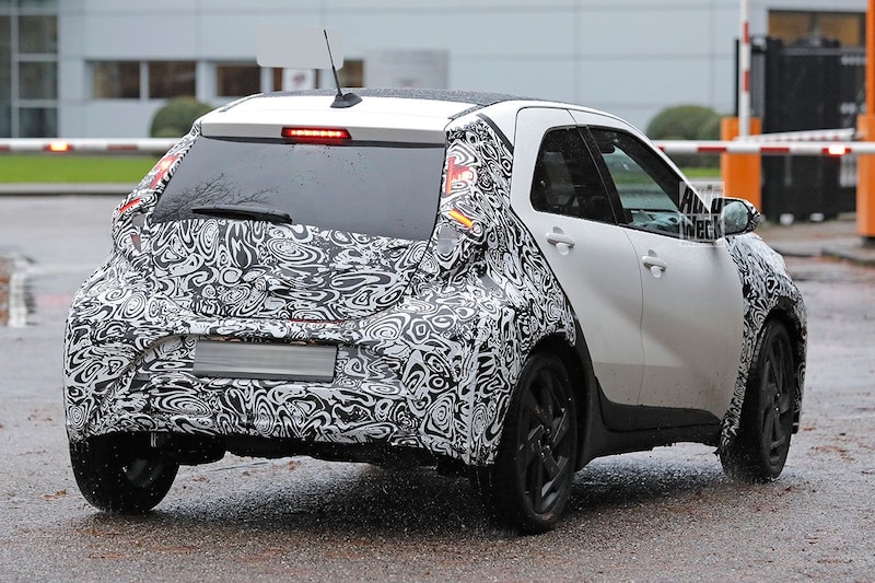 Op deze spionagefoto's zien we een aan de voor- en achterzijde fanatiek met camouflageplakkers bedekte Aygo X. Aan de achterkant lijkt nauwelijks iets te veranderen. Aan de voorzijde zijn de aanpassingen echter ingrijpend. De kleine Japanner krijgt ogenschijnlijk volledig nieuwe koplampen. Ze zijn vooral richting het midden van de grille toe een stuk platter hebben een aanzienlijk scherpere vormgeving. De vorm van de koplampen is dermate anders, dat Toyota zelfs de motorkap vervangt. De koplampen lijken een hapje uit de zijkant ervan te nemen. Toyota had er ook voor kunnen kiezen om de nieuwe units aan de bovenzijde dezelfde lijnen te laten volgen als de oude koplampen. Dat zou een nieuwe motorkap en dus geld besparen. Een opmerkelijke, maar dappere keuze. Eveneens nieuw is de vorm én invulling van de grille en daarmee dus ook de complete voorbumper. De wielen van dit testexemplaar hebben we overigens niet eerder gezien en dus zijn die waarschijnlijk eveneens nieuw.