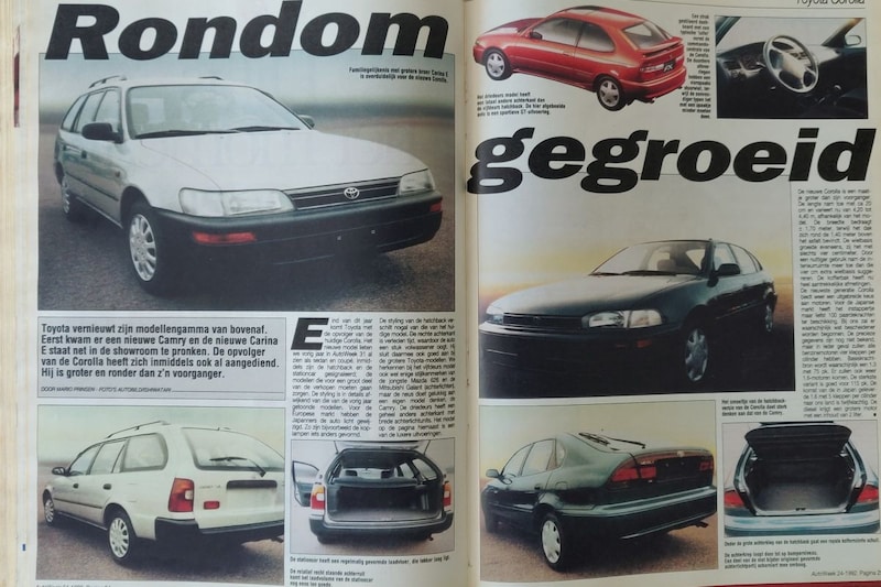 Op één spread stelden we in AutoWeek 24 van 1992 direct bijna alle varianten van de Corolla E100 aan je voor. We openden groot met de stationwagon. Daarop zagen we direct het nieuwe neusje van zowel die ruimste Corolla als van de nieuwe Corolla hatchback. Dat was duidelijk een evolutie van het front van de E90, maar toch eigentijds. Met een zelfverzekerde 'blik' tuurde de Corolla de wereld in. Bij de stationwagon was natuurlijk vooral de achterkant interessant en daar zagen we een zee van ruimte als de klep openging. Toyota had het voor elkaar gekregen om de Corolla stationwagon vrijwel geen tildrempel en een behoorlijk vlakke en ruime laadvloer te geven. Dat maakte het een bijzonder praktisch alternatief voor zijn Europese concurrenten.