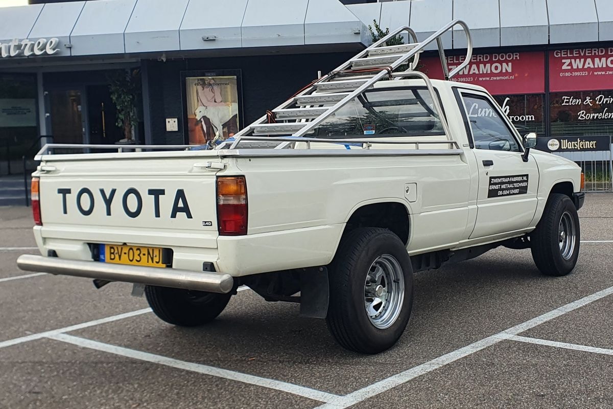 Een wat uitgebreidere fotogalerij dan gebruikelijk deze keer, inclusief zichtbare kentekens en zelfs bedrijfsstickers. We spraken dan ook met de eigenaar, die daar op geen enkele wijze bezwaar tegen heeft. Leo Ernst van Ernst Metaaltechniek uit Reeuwijk is maar wat trots op zijn inmiddels 35 jaar oude Hilux, die ondanks die hoge leeftijd nog met hoge regelmaat wordt ingezet om op maat gemaakte zwemtrappen door het hele land bij klanten te bezorgen.