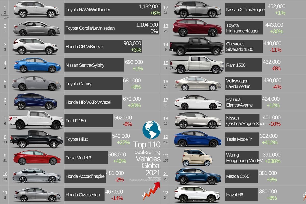 Een lijst samenstellen van de populairste automodellen ter wereld is geen eenvoudige klus. We hebben er dan ook even op moeten wachten, maar dankzij Felipe Munoz weten we nu wat wereldwijd de 110 (!) populairste automodellen waren in 2021. De Toyota RAV4 blijkt de Corolla te hebben ingehaald, maar er zijn meer opvallende conclusies. Zo doet Tesla goede zaken.