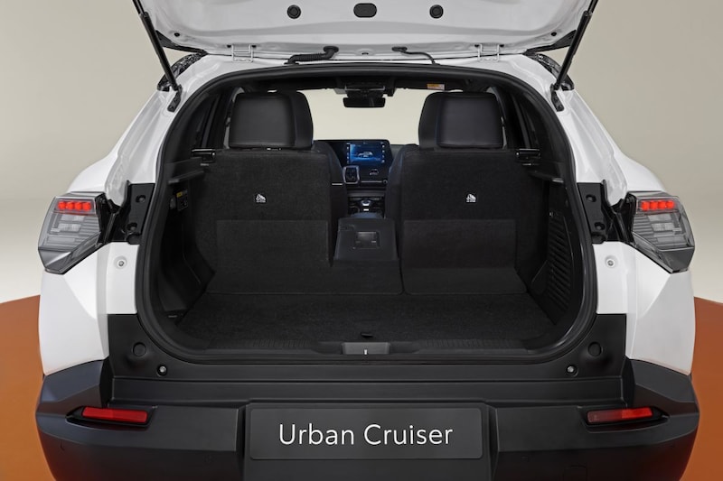 De Toyota Urban Cruiser is 4,29 meter lang, 1,80 meter breed en 1,64 meter hoog. Daarmee valt hij regelrecht in het segment van compacte elektrische cross-overs als de Peugeot e-2008 en diens ontelbare Stellantis-zustermodellen. Je kunt de Toyota Urban Cruiser dan ook zien als een elektrisch alternatief voor de Toyota Yaris Cross. Tussen de voor- en achteras bevindt zich 2,7 meter. Ter vergelijking: de wielbasis van de Yaris Cross is 14 centimeter korter. Ook is de Urban Cruiser 10 centimeter langer, 3,5 centimeter breder en 4,5 centimeter hoger dan de Yaris Cross. De Urban Cruiser zal dan ook flink meer interieurruimte bieden. De Urban Cruiser krijgt onder meer een verschuifbare achterbank, maar moet het net als de e Vitara zonder frunk doen. Geen opbergruimte onder de voorklep dus. Reken op een bagageruimte van zo'n 300 liter.