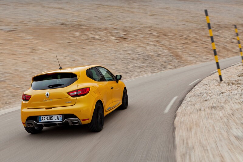 We zien een gele rakker, voorzien van een lekkere bumperkit, dubbele uitlaatpijpjes en forse wielen. Standaard staat hij op 17-inch lichtmetaal, naar wens zijn er sloffen in de maat 18-inch onder te leggen. De RS ziet er ook (en alleen) als vijfdeurs behoorlijk smakelijk uit. De diffuser zorgt voor maar liefst 80 procent van de extra downforce die de nieuwe gepeperde Clio met zich mee krijgt. De andere 20 procent komt voor rekening van de achterspoiler. Wat kleurtjes betreft vat er te kiezen uit vijf smaken, Glacier White, Flamme Red, Profond Black, Platine Grey en Sirius Yellow, die laatste zien we op de persfoto's. In het interieur zijn de nodige sportieve details aangebracht. Het is voornamelijk zwart, maar rode stiksels en RS-embleempjes zorgen voor een sportieve ambiance.