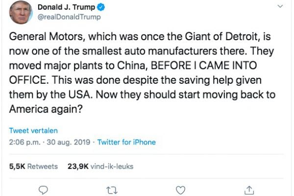 De Amerikaanse president Donald Trump heeft vrijdag General Motors (GM) een veeg uit de pan gegeven. Hij uitte via Twitter onder meer kritiek op het weinige aantal banen dat het autoconcern nog in de Verenigde Staten heeft. Daartegenover heeft GM grootse plannen in China.
