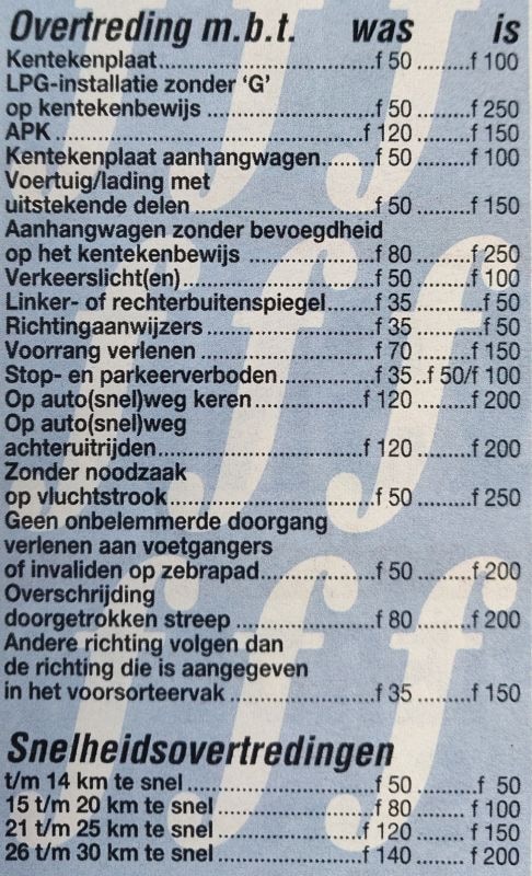 De boetes werden eind 1991 verhoogd, soms aanzienlijk. In bovenstaande overzicht uit AutoWeek 2 van 1992 zie je de verschillen tussen de oude en de 'nieuwe' situatie. Boetes van honderden guldens waren ons toen dus ook zeker niet vreemd. Wat bovendien opvalt, is dat er toen bredere categorieën waren voor snelheidsovertredingen. Tegenwoordig is er een boetebedrag op de kilometer nauwkeurig, waar het toen nog in stapjes van vijf km/h opliep en je tot en met 14 km/h zelfs een vast bedrag kwijt was.