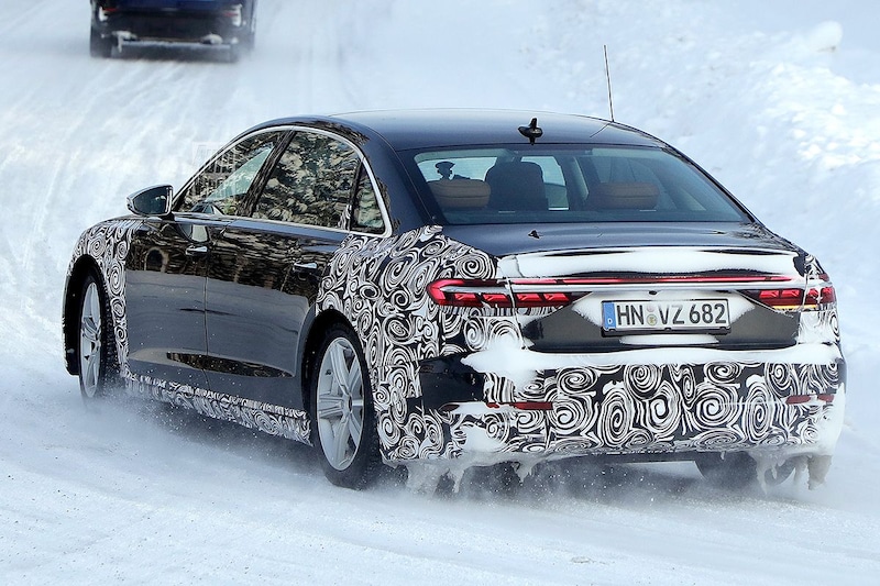 Audi levert de A8 momenteel in twee lengtematen. De 5,17 meter lange reguliere variant met een wielbasis van 3 meter heeft de langere A8 L naast zich. Die A8 L strekt zich uit over een afstand van 5,3 meter waarvan zich 3,13 meter tussen de voor- en achteras bevindt. De ingepakte A8 op deze foto's lijkt nog een stuk langer dan die A8 L. Het achterportier van dit testexemplaar lijkt immers veel groter. Het is goed mogelijk dat Audi het leveringsgamma van de A8 bij de facelift uitbreidt met een uitvoeringwaarmee het merk zijn tanden tracht te zetten in de Maybach-versie van de nieuwe S-klasse. Die Mercedes-Maybach S-klasse is een extra opulente S-klasse die met zijn lengte van 5,47 meter nog eens 18 centimeter langer is dan de S-klasse Lang. De wielbasis van de Maybach S-klasse is met 3,4 meter eveneens 18 centimeter langer dan die van de S-klasse Lang.