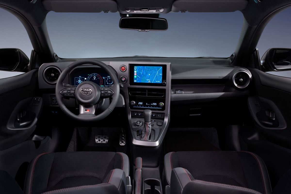 Het interieur is eveneens volledig op de schop genomen. Dat is even wennen. Het dashboard bestaat nu voornamelijk uit een gebogen paneel dat min of meer om de bestuurder is gevormd. Het hoekige geheel omvat onder meer het voortaan 12,3 inch metende digitale infotainmentscherm dat niet meer zoals voorheen ietwat uit het dashboard steekt. Dat zorgt samen met een iets verplaatste binnenspiegel voor beter zicht naar voren. Het instrumentarium is eveneens helemaal anders. Het is gedaan met de gezellige ronde elementen waarin de meerdere kleine displays van instrumentarium zijn verwerkt zoals je dat van de Yaris kent. Goed nieuws voor wie in de GR Yaris geen fijne zitpositie kon vinden: ook die is volgens Toyota verbeterd. De bestuurdersstoel zit voortaan 2,5 centimeter lager in de auto en ook de positie van het stuurwiel is aangepast.