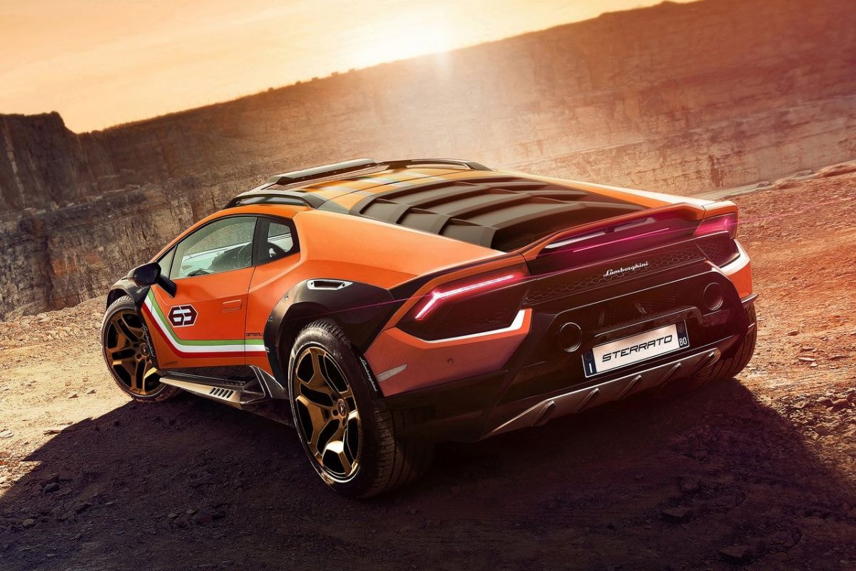 Gigantische banden, brede spatborden, wilde kleuren en felle lampen: de Sterrato Concept maakt bij de eerste aanblik duidelijk dat het niet zomaar een Huracán is. Het model is met niet minder dan 47 mm opgehoogd, een afstand waar menig opgehoogde stationwagen alleen maar van kan dromen. Ook de spoorbreedte is groter, de wielen staan 30 mm verder uit elkaar. Ze hebben een doorsnede van 20 inch en zijn niet voorzien van de fietsbanden die je bij zo’n wielmaat zou verwachten, maar van ballonbanden met een uiterst ruig profiel. Mede dankzij de ophoogsessie is de aanrijhoek aan de voorzijde met 1, en aan de achterzijde met 6,5 procent vergroot. Je moet dus daadwerkelijk zelfstandig uit netelige situaties kunnen komen met je Italiaanse exoot.
