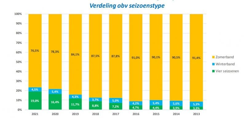 Vier jaar geleden lag vooral het aandeel vierseizoenenbanden nog veel lager. Toen waren de all seasons nog slechts goed voor 7,2 procent aandeel. Weer vier jaar daarvoor, in 2013, was dat nog 3,3 procent. KwikFit noemt geen duidelijke reden voor het groeiende aandeel voor all seasonbanden. Wel is er dit jaar weer een voorzichtige daling in het aandeel winterbanden onder auto's te zien en dat zal verband houden. Steeds meer mensen stappen kennelijk liever over naar banden die niet gewisseld hoeven te worden als het seizoen voorbij is.