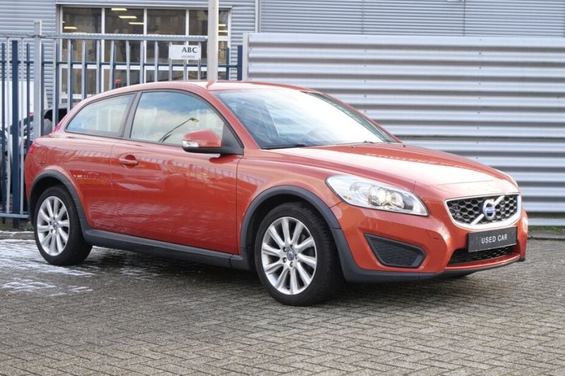 We sluiten af met de jongste en duurste van het stel, deze Volvo C30 1.6 uit 2011. Op bovenstaande foto lijkt hij wellicht meer rood dan oranje, maar in het zonlicht kleurt hij toch echt behoorlijk oranje. Je zou met dat kleurtje bijna denken dat hij eigenlijk liever een Focus ST had willen zijn, daarmee deelt hij immers zijn basis. Hierin vind je alleen geen vijfcilinder van Volvo, maar juist een 1.6 van Ford. Daarmee is de C30 niet bijster vlot, maar het onderstel maakt veel goed. Hij heeft overigens pas zo'n 116.000 km op de teller, dus mag je een frisse auto verwachten.