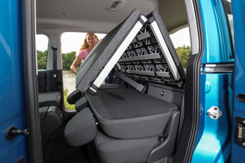 De Caddy California heeft een uitvouwbaar bed dat 1,98 meter lang en 1,07 meter breed is. Bij zijn voorganger maakte de tweede zitrij nog deel uit van de bedconstructie. Dat is niet langer het geval. Wel is het noodzakelijk om de tweede zitrij thuis te laten als je in de nieuwe Caddy California wil overnachten. De camper is desgewenst uit te rusten met een minuscuul keukenblokje dat je uit het achterste van de Caddy California kunt schuiven. Het omvat een gaspitje, een windscherm, een besteklade en diverse opbergmogelijkheden. De aanwezigheid van het keukenblokje maakt het mogelijk de Volkswagen ook daadwerkelijk als camper te registreren. De achterste zijruiten zijn af te dekken met bagagezakken die elk tot 5 kilo aan spul kunnen herbergen. De voorste zijruiten zijn met gordijntjes af te dekken. Nieuw is de optie om een fors glazen panoramadak met een oppervlak van 1,4 vierkante meter te laten monteren. Dat wordt sterren kijken!