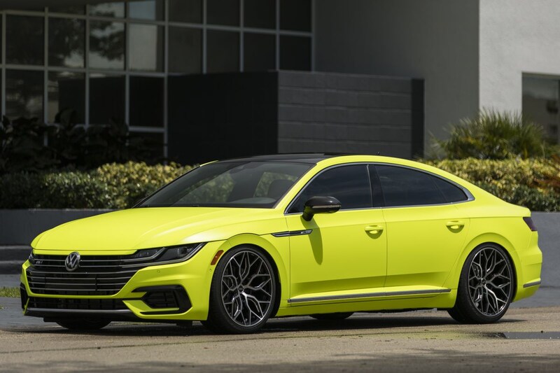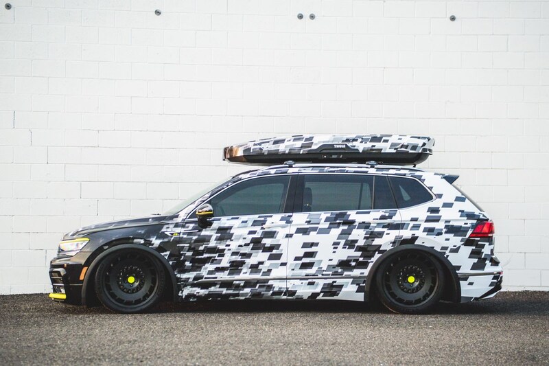 Dan is er de Tiguan R-Line Aero Concept, een van een camouflage-wrap voorziene Tiguan die dankzij 'air ride' wel heel dicht tegen de grond kan worden gelegd. 20-inch wielen en een dakkoffer moeten het plaatje compleet maken. Bij de Arteon R-Line Highlight Concept is het vooral de fluorescerend gele koets die voor extra aandacht moet zorgen. Ook hier 20-inch wielen en een verlagingsset, aanpassingen die bij de Jetta R-Line SoCal Concept op ongeveer dezelfde manier terugkeren, al meten de wielen onder deze sedan 19 inch.