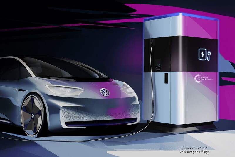 Volkswagen toont een stel designschetsen van een mobiel laadstation waarmee het dit jaar al de eerste praktijktests wil doen.