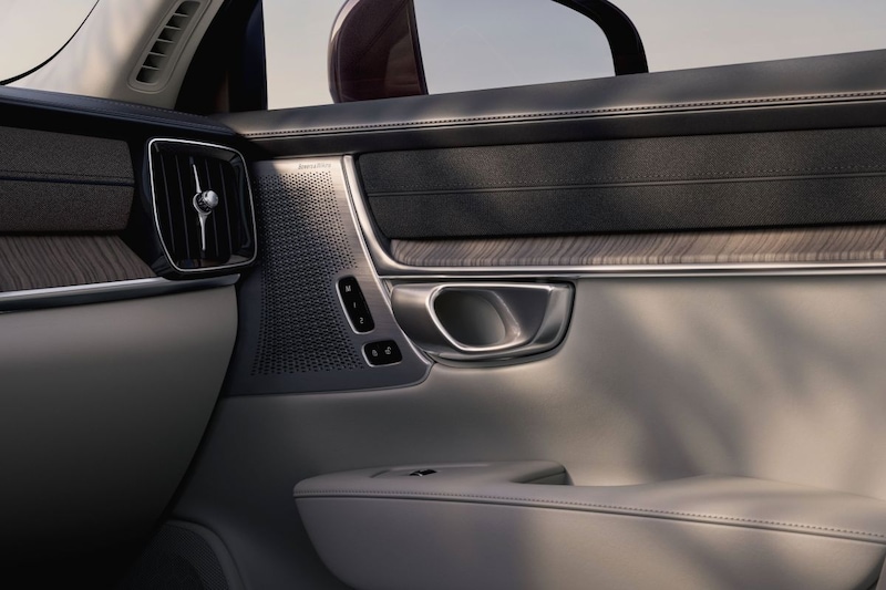 In het interieur blijft het in grote lijnen meer bij hetzelfde. Het is echter niet te missen dat er een nieuw infotainmentscherm in de Volvo S90 zit. Waar het scherm voorheen keurig in het dashboard paste, is het nieuwe scherm daar te groot voor. Dat heeft een diameter van 11,2 inch en het moet volgens Volvo vooral ook een stuk sneller reageren dan het systeem dat er voor de facelift in zat. Na verloop van tijd moet elk model deze generatie infotainment krijgen.