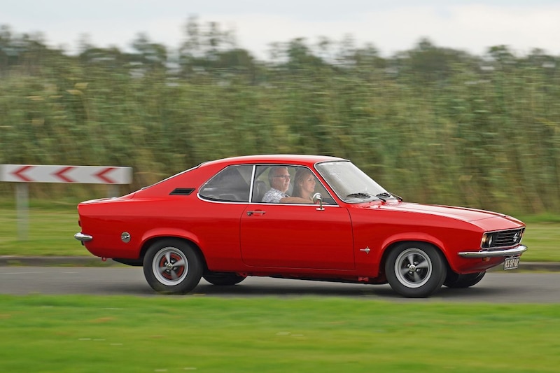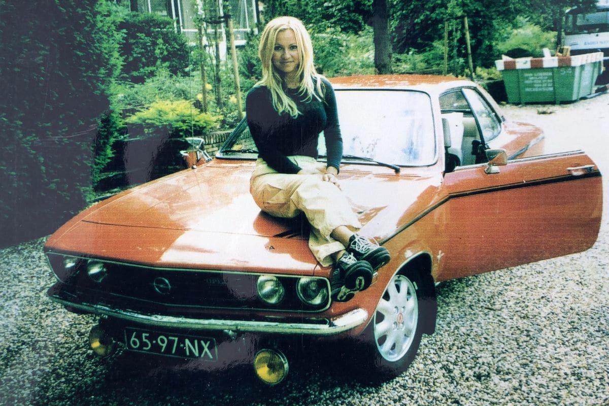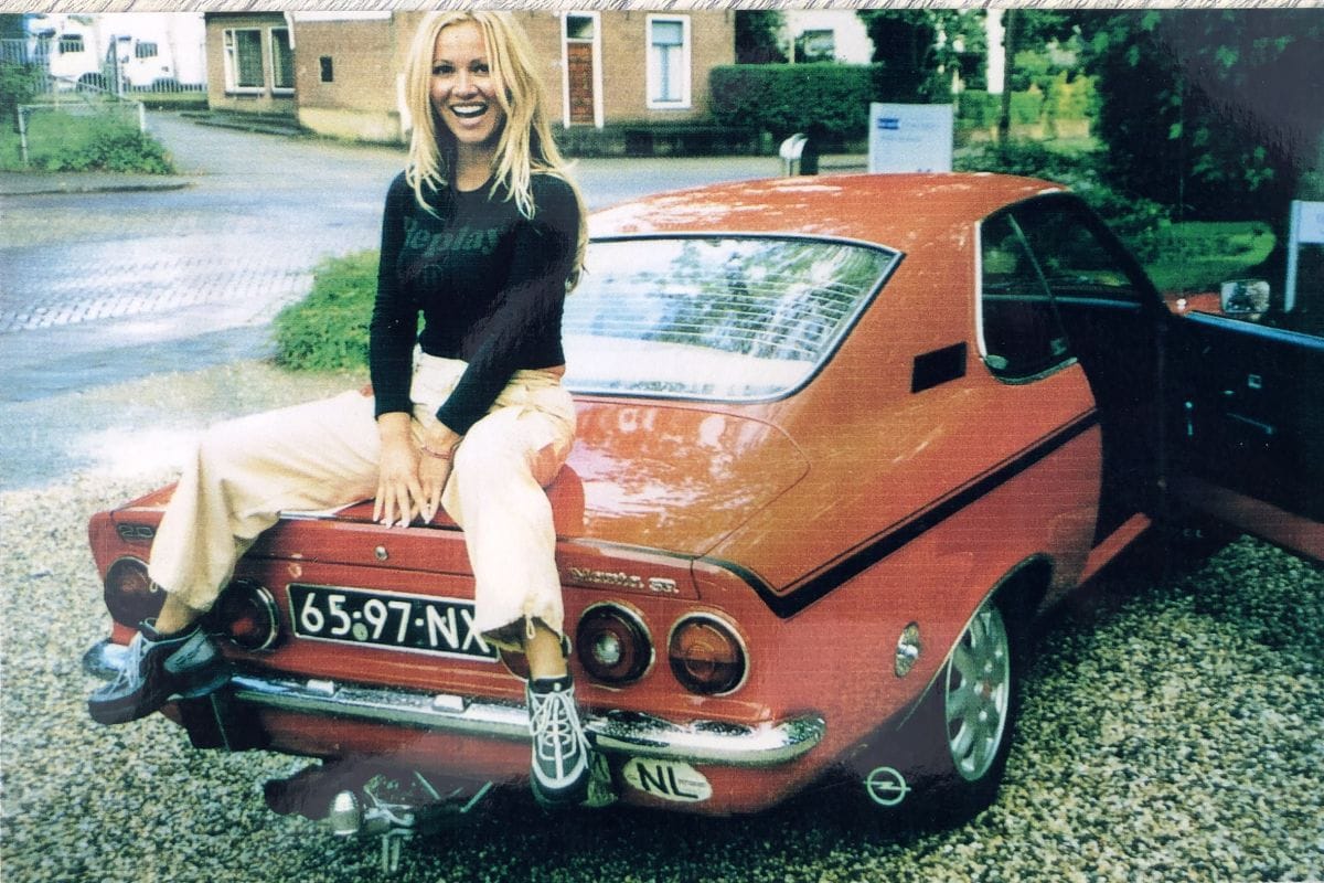 De Opel Manta A met Tatjana op de motorkap. Let ook op de moderne Opel-wielen uit de jaren negentig. Dan is hij nu toch een stuk fraaier en lekker origineel.