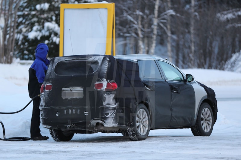 De twee exemplaren die hij wist te kieken zitten logischerwijs nog vol met camouflage, maar desondanks kunnen we wat nieuwe elementen spotten. Zoals de koplampen en knipperlichten, die scherper en ronder ogen dan voorheen. De twee grote spots voorop zijn waarschijnlijk alleen gemonteerd vanwege het beperkte daglicht in deze tijd van het jaar, daar in het hoge noorden. Ook aan de achterzijde valt op dat de verlichtingsunits er anders uitzien dan die van het huidige model. Onze man met de fotocamera geeft aan dat de auto een maatje groter wordt en enkele centimeters langer zal meten dan de huidige Sorento.
