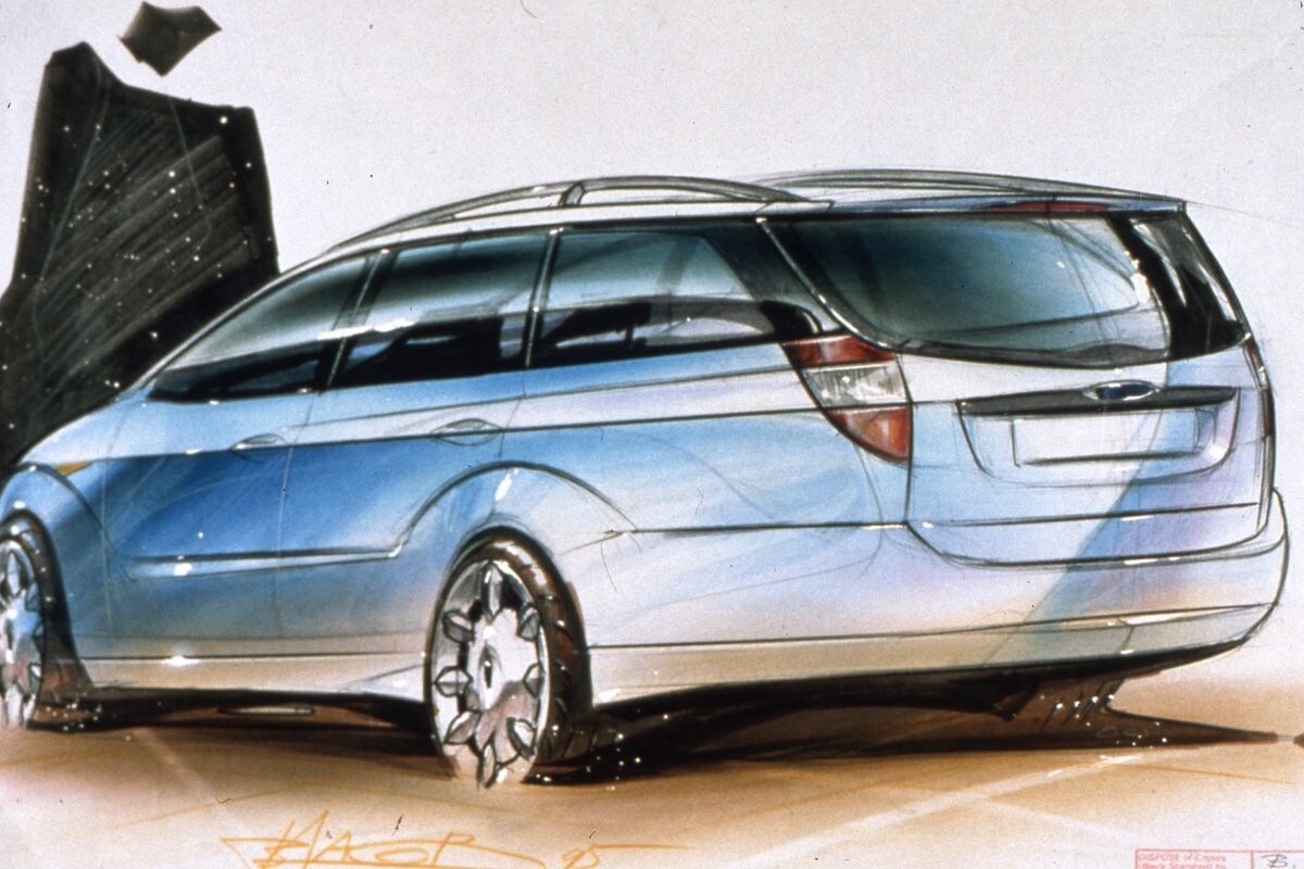 Ford realiseerde zich dat het erop of eronder was na het moeizame bestaan dat de vijfde generatie Escort leidde. De anderhalf jaar geleden overleden Richard Parry-Jones, die heel veel heeft betekend voor de rijdynamiek die Fords vanaf eind jaren 90 kenmerkte, vertelde daarover ooit: “We waren goed in het verkopen van auto’s aan grote fleetowners, maar nu wilden we echt een auto die voor de berijder zelf prettig was.” De laatste Escort, de generatie van 1990 tot 1998, is meerdere keren gefacelift om hem actueel te kunnen houden. Met zijn opvolger wilde Ford een auto neerzetten die van meet af aan goed was en die net als zijn grote broer Mondeo wereldwijd inzetbaar zou zijn. Dat was onderdeel van de Ford 2000-strategie, dus moest de Amerikaanse Focus dezelfde zijn. In de jaren 80 was een Amerikaanse Escort op veel punten anders dan een Europese. In oktober 1996 stuurde Ford de Focus voor het eerst als gecamoufleerd prototype de weg op, precies twee jaar voor de marktintroductie. Bij het zien van de eerste spionageplaten gingen we nog uit van de naam Escort voor de nieuwe compacte midden-klasser. De codenaam voor het project-Focus was C 170. Eind 1996 wisten we dat de nieuwe designstijl New Edge zou gaan heten. De Focus was overigens niet de eerste New Edge-Ford, want de Ka kwam al in 1997, gevolgd door de Puma en de Cougar.Op de foto hierboven en - onder designschetsen van de eerste Ford Focus Wagon. Die zou uiteindelijk wat minder extreem worden vormgegeven dan aanvankelijk de bedoeling was.