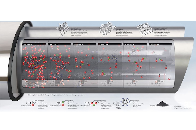 Met de huidige Euro 6-norm mag een auto met dieselmotor bij ons nog maar 80 milligram per kilometer uitstoten, een benzineauto 60 mg. Da's van een heel ander orde dan wat er aan CO2 uit de uitlaat mag komen. Gemiddeld mogen de auto's die een fabrikant in Europa verkoopt maximaal 130 gram CO2 per kilometer uitstoten.