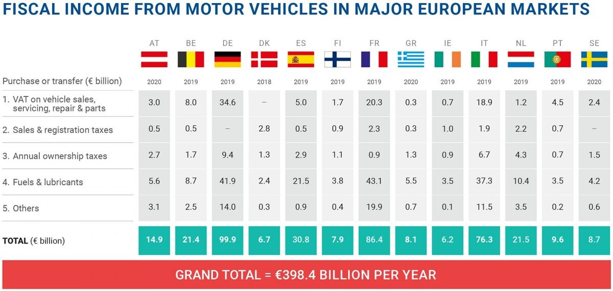 Uit een nieuwe berekening van ACEA, de brancheorganisatie voor autofabrikanten in de EU, blijkt dat er per auto in België het hoogste bedrag aan belastinggeld wordt geïnd. Daar haalt de overheid per auto per jaar dik € 3.000 aan belastingen binnen. Nederland staat op de zesde plaats, met gemiddeld € 2.158 per auto per jaar. Daar horen alle auto-gerelateerde belastingen bij, zoals bpm, mrb, brandstofaccijnzen en btw op onderdelen en onderhoud.