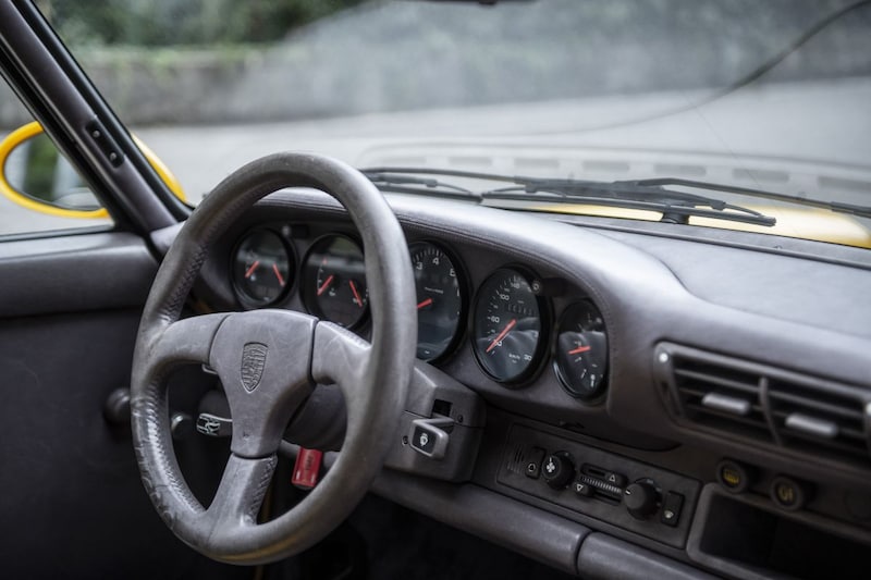 Bij het openen van de portieren hoor je het metalige geklik van het mechanisme, zoals bij alle oude 911’s het geval is. Dat het onderstel met vier millimeter is verlaagd, merk je al zodra je gaat zitten. Het portier zelf voelt lichter aan en zorgt bij het dichtdoen ook voor een minder solide klinkende plof. Net als de voorklep en motorkap zijn ze van met glasvezel versterkte kunststof gemaakt. Verder zijn de zijruiten en de achterruit uit dunner glas vervaardigd. Door ook de achterbank en airbags achterwege te laten, lichtere portierpanelen te monteren en minder geluiddempend materiaal toe te passen, kon het gewicht met 180 kilo worden verlaagd, wat toch dertien procent van het totaalgewicht is. In akoestisch opzicht hoor je in eerste instantie geen verschil. Zelfs in dit snelheidsmonster levert de natuurlijke balans van de zescilinder boxermotor een nagenoeg trillingsvrije loop op. Bovendien dempt de turbo de aanzuiggeluiden. Ook het perfecte zicht naar voren en het beroerde zicht naar achteren in de fraaie, maar te platte Cup-spiegels suggereren dat je hier met een reguliere 964 van doen hebt. Dan merk je echter hoeveel krachtsinspanning het kost om de 235-sloffen op de vooras van richting te veranderen, want stuurbekrachtiging heeft deze auto niet. Gewichtsbesparing, weet je nog? Als je boven de 30 km/h komt, hoor je de eerste steentjes tegen de wielkasten tikken, die geen geluiddempend materiaal hebben. Het knetterharde onderstel geeft zelfs de kleinste oneffenheden maar al te graag door aan de kuipstoelen.