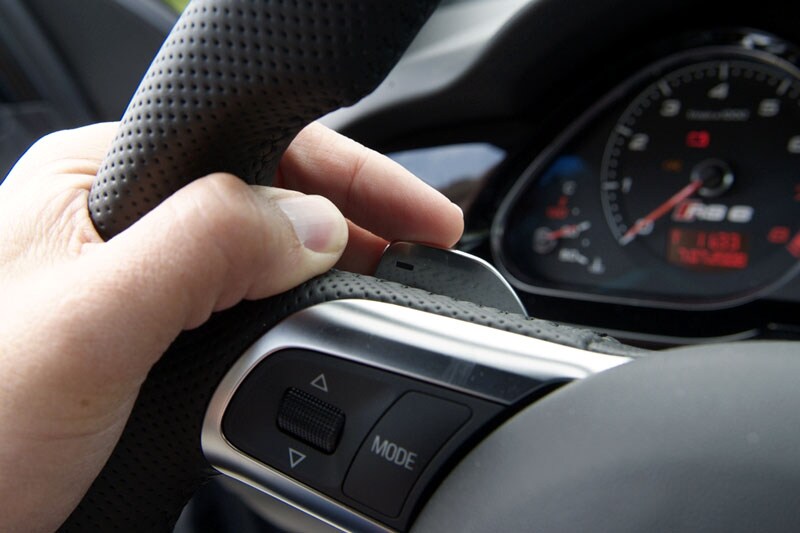 Voorlopig is er geen klaverblad in de buurt. En zeker geen waar ik de ruimte heb om 120 te rijden. Spelen met de flippers achter het stuur en rap door de zes versnellingen schakelen, heeft op dit moment dan ook totaal geen zin. In de vorige editie van de RS6 stond er nog 'Recaro' in het leer op de goed ondersteunende rugleuningen geperst. Nu heeft Audi werkelijk geen plekje onbenut gelaten om er het RS6-logo op te plakken. Het mag niemand ontgaan dat het hier om een über-Audi gaat.