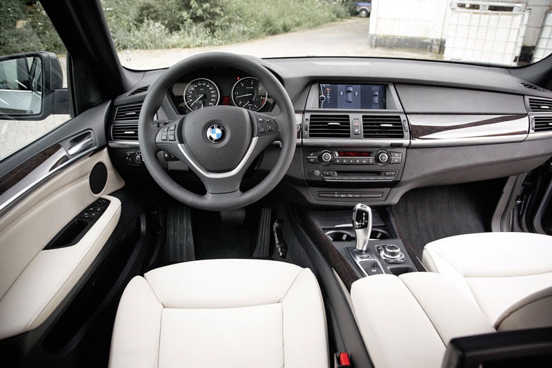 Bij de facelift heeft BMW de koets van de X5 vrijwel onaangeroerd gelaten en zich geconcentreerd op het zuiniger maken van de motoren. Pas in 2013, wanneer de nieuwe X5 zijn opwachting maakt, zal de auto geheel anders smoelen. Tot dan volstaat BMW met een bescheiden facelift. Vooraan heeft de bumper een extra likje verf gehad en verder is zowel vóór als achter een zilverkleurige bodemprotector gemonteerd. Ook hebben de lichten in de achterlichtunits voortaan een L-vorm. Het X5-dash is bijna symmetrisch en ziet er door het relatief kleine aantal knopjes opgeruimd uit. Typisch BMW is die wat merkwaardig gevormde versnellingspook. Schakelen kan ook met grote aluminium flippers achter dat stevige, kleine stuurwiel. Aanvankelijk was de interieurruimte van de X5 niet bepaald indrukwekkend. Bij de tweede generatie van de SUV zette BMW dit ongemak recht. De X5 groeide aanmerkelijk en de kritiek over gebrek aan ruimte aan boord verstomde. Met name de kofferbak was bij de eerste editie wat krap bemeten. Dat is nu veel beter. De huidige versie biedt achterin 620 liter en met de achterste zitrij plat 1.750 liter. Onze test-X5 heeft zelfs een eenvoudig in de vloer weg te bergen derde zitrij. Dat de terreinauto is verworden tot een statussymbool maakt het interieur duidelijk, vooral het met leer overtrokken zitmeubilair. Je haalt het niet in je hoofd om met je modderige lieslaarzen plaats te nemen in de stoelen van de BMW.
