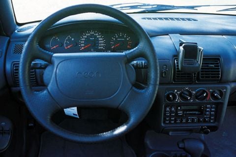 Dat komt vooral door die drietraps automaat die er af en toe op los moet "gieren" om de motortoerentallen bij te houden. Zo klinkt dat tenminste. De theoretisch bovenmodale aandrijflijn kan het in de praktijk niet waarmaken; daar is hij domweg niet geraffineerd genoeg voor. Activeer maar eens de kickdown onderweg - "t is alsof de wereld vergaat. Nee, de Neon is heus vlot zat en verraste ons nog met een plezierig verbruik (voor een 2.0 met automaat) maar motor en bak hebben nog een fijnafstemming nodig. Op constante snelheid is er overigens niets aan de hand. Dan klinkt hij, tot 140 km/h, zeer bescheiden.