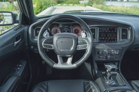 Dat kan bepaald geen kwaad, ontdekken we al snel. De achterbanden verliezen dolgraag grip en de kont zet snel een stapje opzij, zelfs met ingeschakeld ESP. Dat klinkt enger dan het is, want de Charger rijdt niet zo intimiderend als hij oogt. Het uitbreken laat zich goed voorspellen en is met een kleine stuurbeweging goed op te vangen. Wie aan de goede kant van de gripgrens blijft, komt bovendien nog best de hoek om met dit apparaat. Sinds 2020 wordt de Hellcat dan ook standaard geleverd als ‘Widebody’. Die is herkenbaar aan zijn enorme spatbordverbreders en heeft ten opzichte van eerdere versies bredere banden, maar daarbij ook instelbare elektronische stuurbekrachtiging en schokdempers van Bilstein.