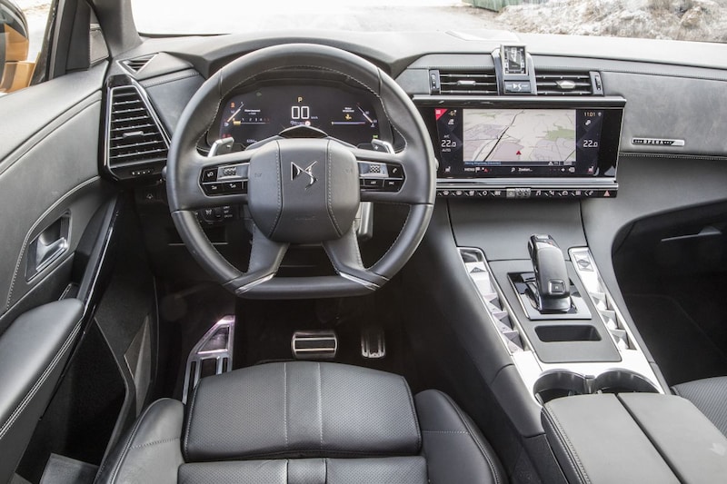 Hoewel luchtvering niet tot de mogelijkheden behoort, beschikt DS wel over een andere troef in de vorm van Active Scan Suspension. Een camera achter de voorruit leest daarmee het wegdek en past de adaptieve schokdempers aan op wat er wordt waargenomen. Dat werkt in de praktijk erg goed. De 7 richt zich vooral op comfort, maar vangt de klappen goed op als dat nodig is. Bovendien werkt de besturing nauwkeurig en hoewel alle kracht alleen naar de voorwielen gaat, worden die niet makkelijk overmeesterd.