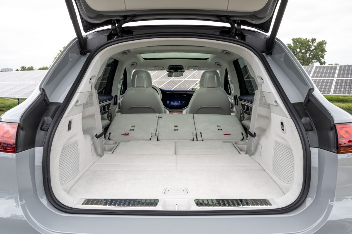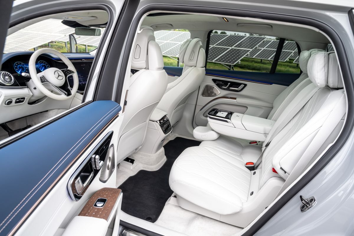 Verder rolt hij nauwelijks over zijn banden en het ESP-systeem – dat bij Mercedes nooit helemaal uitstaat – grijpt later in dan verwacht. Wanneer we even later weer op de snelweg rijden, valt opnieuw de enorme stilte in het interieur op. Wind lijkt nauwelijks vat te krijgen op de carrosserie en ook het bandengeluid – vaak de grootste spelbreker in elektrische auto’s – is nauwelijks hoorbaar. Het is de ultieme metgezel voor lange afstanden en tevens een alleskunner met desgewenst plek voor zeven inzittenden.