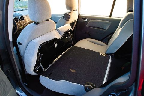 Ford vindt dat er op de achterbank plaats is voor drie passagiers en daarom is er ook een derde hoofdsteun, die helemaal omlaag kan schuiven voor onbelemmerd zicht naar achteren. Ook een derde driepuntsgordel is aanwezig, maar voor drie volwassenen is het echt krap. Het interieur van de Fusion is minder flexibel dan we hadden verwacht. Met de achterbank in gebruik is de inhoud van de bagageruimte 337 liter, 53 liter meer in dan de gewone Fiesta. De achterbank kan in ongelijke delen worden omgeklapt, zodat een laadruim ontstaat van 1.175 liter, maar dat is in de compacte klasse niet echt heel bijzonder. Jammer dat er geen vlakke laadvloer ontstaat en dat de neergeklapte rugleuning, als je hem weer naar boven wilt halen, blijft haken achter de rechtopstaande zitting. Praktisch is wel de neerklapbare rugleuning van de passagiersstoel, waardoor het vervoeren van lange spullen mogelijk is. De Fusion heeft een lage laaddrempel, maar de handgreep van de achterklep zit eveneens behoorlijk laag. Je moet bukken om het sleuteltje in het slot te steken. Je kunt de klep ook openen met een knop boven op het dashboard. Dat is bijna een uitnodiging aan het dievengilde. 't Zijn misschien kleine dingen, maar het komt niet erg doordacht op ons over.