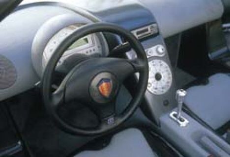 Over simpel en functioneel gesproken: moet je het interieur zien. In één groot, cirkelvormig paneel verenigen zich zo'n beetje alle bedieningsorganen. Of je nu de ramen open wil doen, de motor wilt starten (tuurlijk: startknop) of de lichten aan wilt doen: daar moet je wezen. Achter het stuur zit alleen een toeren- en kilometerteller en een digitaal display dat je nog eens meedeelt hoe hard je rijdt en wat bijvoorbeeld de oliedruk is. Helemaal een toonbeeld van simplisme zijn de stoelen: één stuk koolstofvezel, bekleed met een paar simpele repen gevuld leer. Wonder boven wonder: ze zitten uitstekend. Goed, je hangt wat achterover, Formule 1-stijl, maar in die positie zou je bij de bloedstollende acceleraties van de CC toch wel terecht zijn gekomen. Voordat je op die stoelen zit, ben je overigens langs nóg een bijzonderheid gekomen: de deuren. Want gewone portieren, dat was weer te simpel geweest, en dus heeft de Koenigsegg CC naar voren klappende vleugeldeuren. Zoals zo'n beetje alles vleugelt aan de CC: wie de auto met deuren, motorkap en 'kofferdeksel' open ziet, krijgt onmiddellijk het idee dat buitenaards leven bestaat, maar een metalige insektenvorm heeft aangenomen. Instappen is, zoals bij de meeste van dit soort monsterauto's, geen eenvoudige opgave; daar zorgen de enorme dorpel en de beperkte hoogte van het dak wel voor. Maar als gezegd: wie eenmaal zit, zit goed. Totdat de motor wordt gestart...
