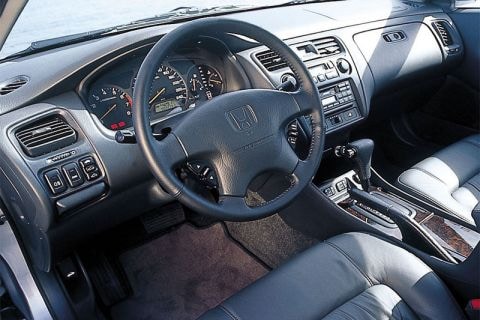 Het interieur is keurig. Ook hier merk je weer dat de Accord Coupé voor de Amerikaanse markt gemaakt is, want daar zijn ze nu eenmaal dol op grote plastic knoppen en als ze die willen, dan kunnen ze die van Honda krijgen ook. Zo komt, net als bijvoorbeeld bij een Corvette ook het geval is, het hele interieur wat kunststofferig over. Nooit-geleefd-hebbend hout zorgt hier en daar nog voor wat kleur. Maar vooruit, het zit allemaal goed in elkaar en we hebben zeker bij Japanners wel eens ergere soorten plastic gezien. De bediening is gewoon dik in orde. Alle meters en knopjes zitten onder handbereik en de meeste dingen doen wat je van ze verwacht. We zeggen 'de meeste', omdat we een paar stevige ruzies met de airco hebben gehad, die echter met een paar simpele blikken op het instructieboekje al heel wat eerder bijgelegd had kunnen worden. Kleinigheidje.
