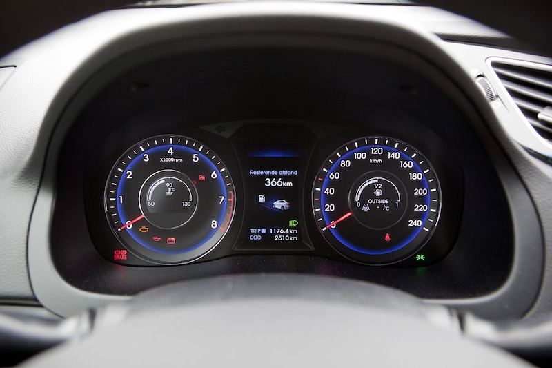 Op het dashboard is het een drukte van belang, maar dat betekent ook dat het er rijk uitgerust uitziet. Het grote kleurendisplay is centraal in de middenconsole geplaatst, met daaronder de belangrijkste bedieningsknoppen. Ook het stuur is rijkelijk bezaaid met knoppen. Tussen de beide klokken zit een polychroom infoscherm, en ook in het hart van de klokken is informatie te zien. De materialen dragen bij aan het hoogwaardige gevoel dat de i40 je geeft. Zachte structuren overheersen en de aluminiumkleurige strip die over de hele breedte loopt, maakt het interieur erg mooi. Hyundai heeft een lekker stevig aanvoelend, met leer bekleed stuur gemonteerd dat je ver naar je toe kunt trekken. Ook de stoelen zitten erg goed, maar ze zouden wel wat verder omlaag mogen. De A-stijlen zijn fors, waardoor ze een flinke hap nemen uit met name je zicht naar linksvoor. De zit achterin is heel behoorlijk. Even je hoofd intrekken bij het instappen, want de C-stijl helt ver naar voren, maar wanneer je eenmaal zit, heb je hier een heel behoorlijke ruimte, zowel voor de benen als voor je hoofd. Wat betreft de bagageruimte blinkt de i40 niet uit. De inhoud is met ruim 500 liter netjes, maar zeker niet riant in deze klasse. Bovendien is de toegang door de kleine klep krap.