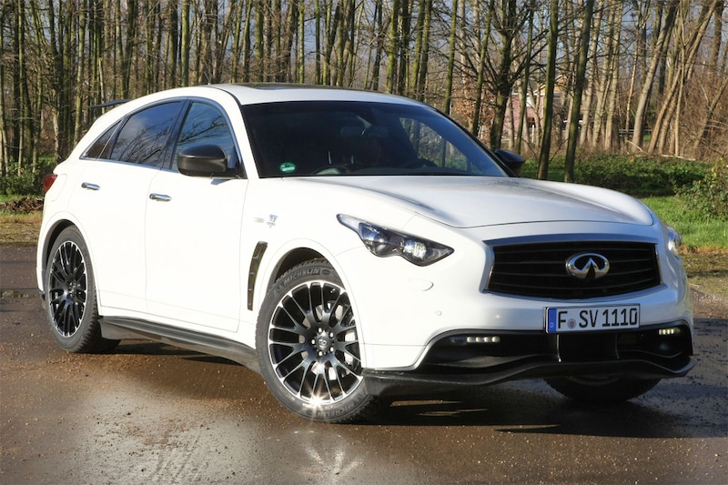 De Infiniti FX50 Sebastian Vettel, zo heet-ie officieel; het spierwitte, bovengemiddeld heftig bespoilerde gevaarte waarmee we vandaag kortstondig kennis kunnen maken. Kortstondig, want de auto is vanuit Duitsland voor een bliksembezoek bij de dealer in Rotterdam afgeleverd en we zijn niet de enige die met deze bijzondere FX op pad willen. Het verhaal achter deze auto luidt als volgt: Sebastian Vettel, destijds nog 'slechts' twee keer wereldkampioen, staat in 2011 op de autobeurs van Genève te babbelen met Shiro Nakamura, de Senior Vice President van Infiniti. Of het geen leuk idee is om 'iets' te doen met de FX50. Die mag van Vettel, die dan een FX50 S Premium 'van de zaak' rijdt, wel een tandje sportiever. Een half jaar later staat in Frankfurt een studiemodel van de FX-volgens-Vettel te glimmen en op de beursvloer waar het idee ontstond staat in maart 2012 de productieversie van de auto. De oplage blijft beperkt tot 150 exemplaren, die vanaf februari door het Duitse bedrijf CRD – onderdeel van Brabus – in Bottrop elkaar worden geschroefd. Wat hebben Nakamura en Vettel gedaan om de FX om te toveren tot de auto – een van de zes voorseriemodellen - waarmee we vandaag op pad gaan? Het 20 mm verlaagde koetswerk zorgt samen met een serieus spoilerpakket en een kanon van een diffusor aan de achterzijde voor een vijf procent lagere luchtweerstand en een toename van de neerwaartse druk van liefst 30 procent, waardoor de FX stabieler blijft bij hoge bochtsnelheden. Die koolstofvezel dakspoiler is overigens optioneel, dus mocht die je te opzichtig zijn…