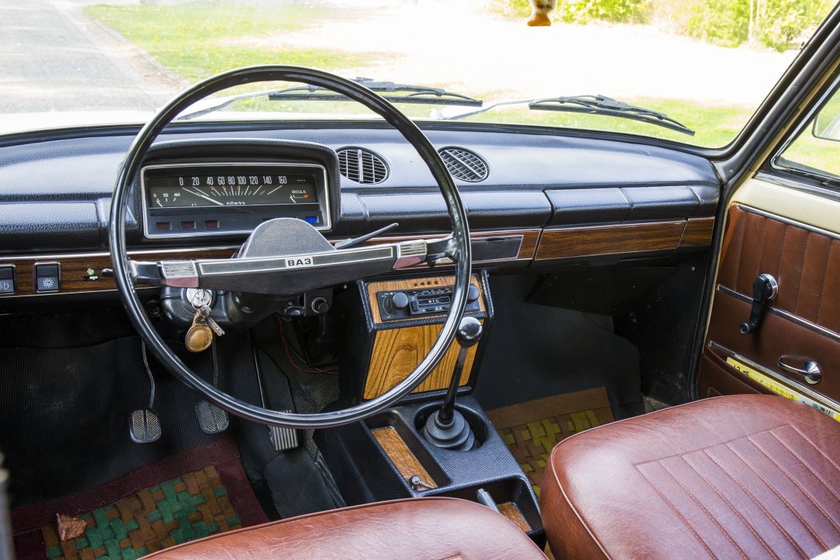 Er schijnt een zonnetje op het houtfineer dat het dashboard en de zelfgebouwde middenconsole siert. De lange versnellingspook laat zich vrij soepeltjes door de bak met tandwielen dirigeren; voor de besturing is beduidend meer spierkracht vereist. De robuuste Lada is gebouwd om de zandige wegen door de taiga of langs een steppe te trotseren en zo voelt hij dan ook aan. De vering had zelfs wel een stukje soepeler gemogen. Dit moet geen pretje geweest zijn om de bijna duizend kilometer lange trip van Togliatti naar Moskou mee te maken. En mocht je onderweg een lekke band krijgen of startproblemen in de vroege morgen, geen punt: de gereedschapsset bevat onder meer een bandreparatiekit inclusief pomp en zelfs een zwengel om de motor aan te slingeren. Het ontwerp van de 1200 is even simpel als briljant. Strakke, basale lijnen. Een koets die nog hoekiger en bonkiger is dan die van de eerste Volvo 144. Eenvoudiger kan het haast niet. Dat simpele maakt deze Lada juist ook weer charmant en hij vormt met zijn zachte prijs een leuke aanbieding voor de man of vrouw met de kleine beurs die ook graag een klassieker rijdt. Deze Lada 1200 stond bijvoorbeeld een aantal jaren geleden voor € 3.500 te koop.