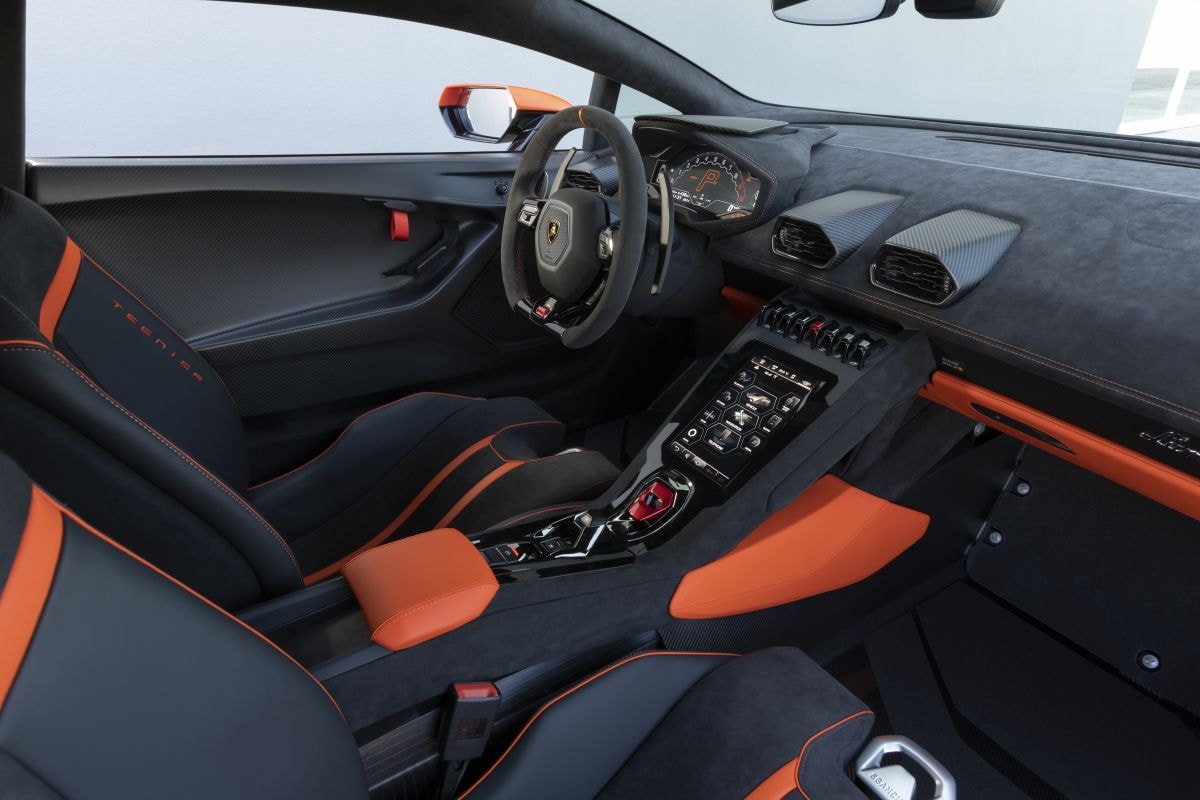 En dat klopt. De neus heeft wel wat weg van de Sian en de 6,1 centimeter langere body doet denken aan de extreme Essenza SCV12. Volgens Lamborghini biedt de Tecnica 35 procent meer neerwaartse druk op de achterwielen dan de reguliere Huracán EVO. De voorzijde heeft luchtinlaten die beter geschikt zijn om koellucht te leiden naar de koolstofkeramische remmen. Hoewel de achterspoiler veel kleiner is dan bij de STO is het vooral van achteren nog altijd een imponerende auto, met zijn enorme diffuser en gigantische uitlaten.