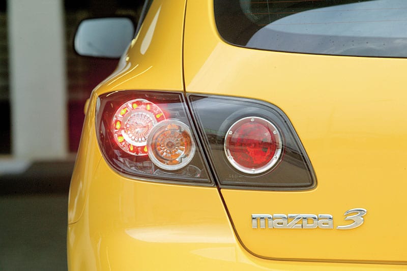 Qua uiterlijk is de Mazda3 een aandachttrekker. Zeker in het knalgeel, zoals onze testauto. De Activeuitvoering heeft een afwijkende grille in de kleur van de carrosserie. Samen met de xenonkoplampen geeft dat een agressief aanzien. Door de rondingen en de bescheiden achterspoiler ziet de 3 er wulps uit. De donkere achterlichten zijn in combinatie met de knalgele lak bijna te veel van het goede. Je moet ervan houden, want opvallen zul je!