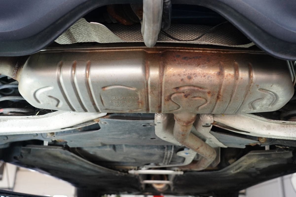 De edelmetalen uitlaat gaat al tien jaar mee onder deze Mercedes-Benz A-klasse.