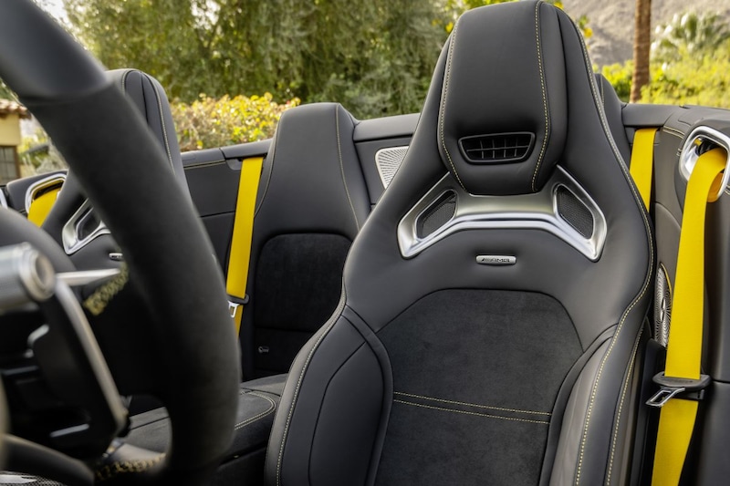 Als het gaat om de rijeigenschappen komt het woord ‘verfijning’ als eerste in je op. Waar de laatste SL-modellen toch wat gezapig aanvoelden met hun neiging om in de bochten wat over te hellen, voelt het nieuwste model veel meer gefocust aan. Echter zonder de soms wat vermoeiende neiging van de AMG GT om onophoudelijk hobbels, bobbels en dwarsrichels ongefilterd door te geven aan zijn inzittenden. Zelfs bij het indrukken van de Sport- en Sport+ knop verandert de auto niet in een plank met stoterige vering, want ook dan blijft het onderstel moeiteloos korte oneffenheden opslokken. De negentraps Speedshift-automaat doet zijn werk onberispelijk. De bak schakelt soepel in de comfortstand en snel en met enorme klappen in standje Sport+.