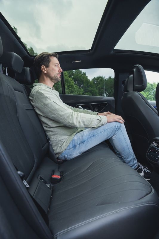 Doordat de EQE een stuk korter is dan de EQS, heeft hij uiteraard ook minder ruimte te bieden. Je zit gevoelsmatig vrij hoog en het glazen panoramadak slokt kostbare hoofdruimte op. Dat merk je vooral achterin. De aflopende daklijn helpt daar niet bij. Voor je benen is genoeg ruimte, maar de EQE verliest een directe vergelijking met de E-klasse. Dat geldt ook voor de kofferbak van de EQE: hierin past niet meer dan 430 liter. Middenklasseformaat. Mercedes levert de EQE wel met een trekhaak. Daaraan mag een (geremd) gewicht van 750 kilo worden gekoppeld.