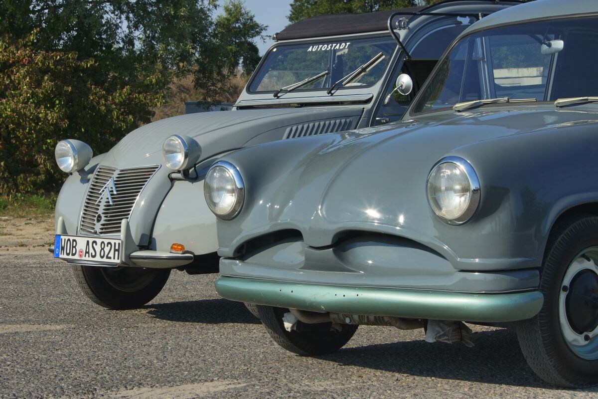 Dan parkeren we de VW, die nu 2.857 kilometer op de klok heeft, en stappen in de Eend. We doen het portier van de 2 CV voorzichtig dicht, zodat de opgeklapte zijruit niet dichtvalt. We draaien de contactsleutel van links naar rechts, trekken de choke (‘S’) voor het stuur uit en drukken dan op de startknop (‘D’). We horen dan een soort gesnater – deze auto had ook best ‘Eend’ genoemd kunnen worden als hij er heel anders uit had gezien. Waar de Volkswagen strak door de bocht gaat, waggelt de Eend op opvallend soepele wijze heen en weer. Bijna alles wat we zien of aanraken onder zijn roldak is gebaseerd op een ingenieus of op zijn minst gewaagd idee. Vergeleken met deze extreem innovatieve auto doet zijn beoogde Duitse tegenhanger een beetje saai aan, maar het onderschatten van grijze muizen is vaak een vergissing.