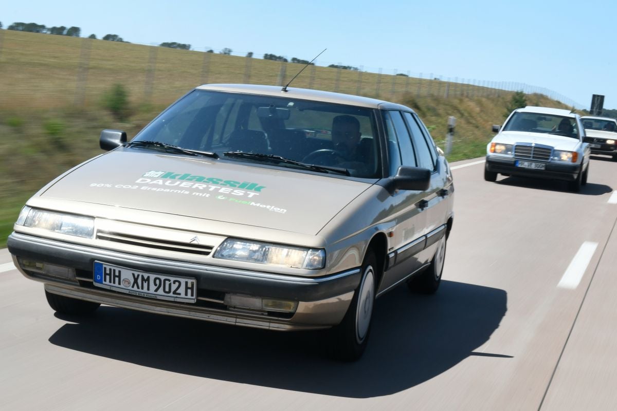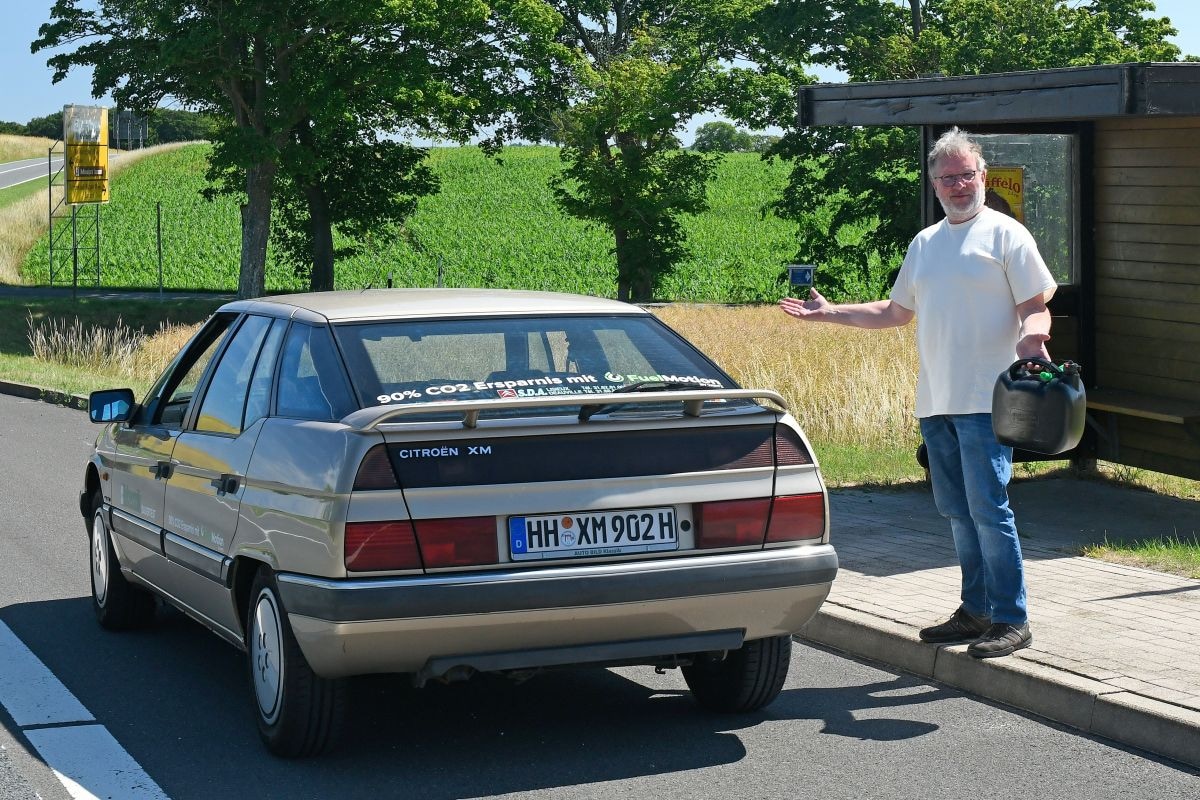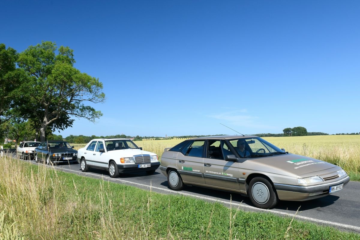 We hebben daarnaast de regels iets veranderd. We starten op ons testparcours in Parchim, rijden via Rostock naar het eiland Rügen en vervolgens naar Hamburg. De rit gaat in konvooi met een maximumsnelheid van 130 km/h. De vier coureurs wisselen regelmatig van auto, zodat de rijstijl niet de doorslag geeft. ’s Ochtends worden de auto’s afgetankt. Dat is een kwestie van geduld voor de bestuurders en alle anderen die willen tanken. Redacteur Dirk Hansen was in 1990 als bestuurder van de XM ook betrokken bij de verbruikstest en volgt de procedure volgens het beproefde recept: druppel voor druppel, waarbij de auto tussendoor flink heen en weer wordt geschud om te voorkomen dat er luchtbellen in de tank ontstaan.