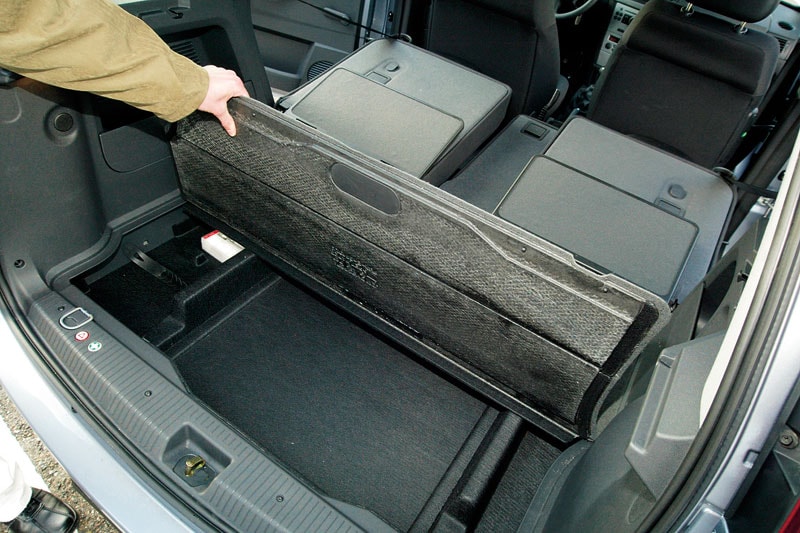 Door z'n langgerekte vorm, hooggeplaatste achterlichten en wat hoekige lijnenspel zie je er aan de buitenkant aan af dat 'ie binnenin best wel eens ruim zou kunnen zijn. De wielbasis is maar liefst 2,63 meter en dat is goed nieuws voor de achterpassagiers. Die kunnen hun lange stelten prima kwijt. De achterbank van de Meriva is er eentje van 't flexibele soort. De achterbank is bij fabrikanten van MPV's het ultieme speeltje van de binnenhuisarchitecten; daar kunnen ze zich heerlijk op uitleven. Je kunt het middelste deel laten zakken en de twee buitenste stoelen naar elkaar toeschuiven. Ook is het meubilair naar voren en achteren te schuiven en zijn de rugleuningen verstelbaar. Je moet trouwens wat spierkracht gebruiken om de achterbank te transformeren. 't Mag dan wat zwaar gaan, 't voelt wel solide aan. Een derde driepuntsgordel zit opgeborgen in het plafond. Het wekt geen verbazing dat de bagageruimte van de Meriva best groot is: 490 liter, te vergroten tot maximaal 1.410 liter. Als je de klep in de laadvloer optilt, doemt daar nog een extra opbergruimte op.