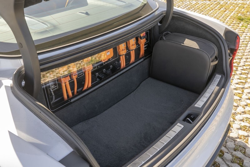 De 309 pk sterke 2,0-liter benzinemotor wordt net als de automatische achtbak uit de T8 Twin Engine-modellen overgeheveld. Toch zijn er ook grote verschillen. Waar de Volvo’s met ‘Polestar Engineered’-label dankzij de hulp van een elektromotor bij de achteras in totaal maximaal 405 pk leveren, krijgt bij de Polestar elk achterwiel een eigen motor toebedeeld. Samen met een aan de benzinemotor gekoppelde starter/generator komt het totale vermogen daarmee uit op een indrukwekkende 609 pk, bij een koppel van maar liefst 1.000 Nm. Supercar-achtige waarden, maar het gewicht is eveneens indrukwekkend. Dat de Polestar 1 meer weegt dan een fullsize Range Rover in dieseltrim, komt vooral door het accupakket. De voor een plug-in hybride ongebruikelijk grote capaciteit van 34 kWh kan de 2.350 kg wegende coupé in theorie 124 km elektrisch voortbewegen. In de praktijk kwamen we net geen 100 km ver, nog altijd meer dan genoeg voor de meeste dagelijkse ritten en meer dan ooit tevoren in een hybride. De accu’s zijn weggestopt in de middentunnel en de kofferbak en snoepen op beide plekken flink wat bergruimte weg. Onder de armsteun kan je hooguit nog een zonnebril kwijt, terwijl de mogelijkheden van de kofferbak met 143 liter erg beperkt zijn. Toch is het openen van de klep elke keer een feest, want Polestar heeft van het achterste accupakket een waar kunstukje gemaakt; je ziet een verlichte etalage vol stekkers en kabels. En dat is niet het enige detail waardoor de Polestar een voortijdig van het podium ontsnapte concept-car lijkt. Ook de niet-omrande, als geheel verstelbare buitenspiegels zijn uniek, net als de bijzonder fraaie manier waarop de achterbank optisch aan de rest van het interieur is gesmolten. Ook de goudgele gordels, een typisch Polestar-geintje, zorgen voor een opvallend contrast.