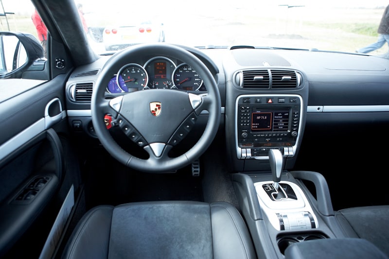 Uiteraard biedt de Duitse SUV meer dan genoeg ruimte aan vijf inzittenden en hun bagage. Bij deze auto gaat het natuurlijk over veel meer; over rijdynamiek, luxe, status. De standaarduitrusting is dan ook riant. Van elektrisch verstelbaar en met leer bekleed zitmeubilair tot dual zone klimaatregeling en cruisecontrol, alles is aan boord. Het dashboard is van typische Porsche-snit. Dat komt doordat van achter het stuur vijf ronde, in elkaar geschoven instrumenten je aanstaren. Valt er licht van buiten op de klokkenwinkel, dan laat de afleesbaarheid helaas te wensen over. De middensectie is redelijk logisch van opzet. De knopjes rond het display zouden wel wat groter mogen zijn. De chroomkleurige kantelschakelaars voor de airco, onder in het middendeel van het dash, zijn leuk gevonden en ook de vormgeving van het bedieningscluster van het Porsche Dynamic Chassis Control in de middenconsole ziet er alleraardigst uit.