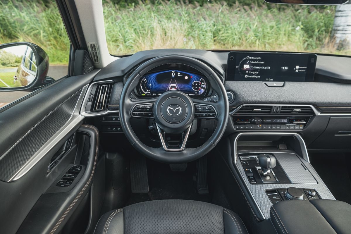 Het is Mazda’s eerste plug-in hybrid, dus beginnen we met het rijden. De volgende eigenaar is erg positief: “Woon-werk is voor mij 40 km en dat gaat met gemak in EV-modus. Dan komt de auto prima met het verkeer mee. In twee uur is de auto weer vol voor de terugreis. Zet je de rijmodus op Sport, dan zit je in een echte Japanse raket. De auto trekt dan als een dolle met een flinke roffel uit de motor. De 8-bak schakelt soepel en wanneer je het zelf ook zou doen. Gecombineerd met een wegligging waar de BMW X1 (de vorige auto van deze rijder) niet eens bij in de buurt komt is de rijervaring echt fantastisch.”